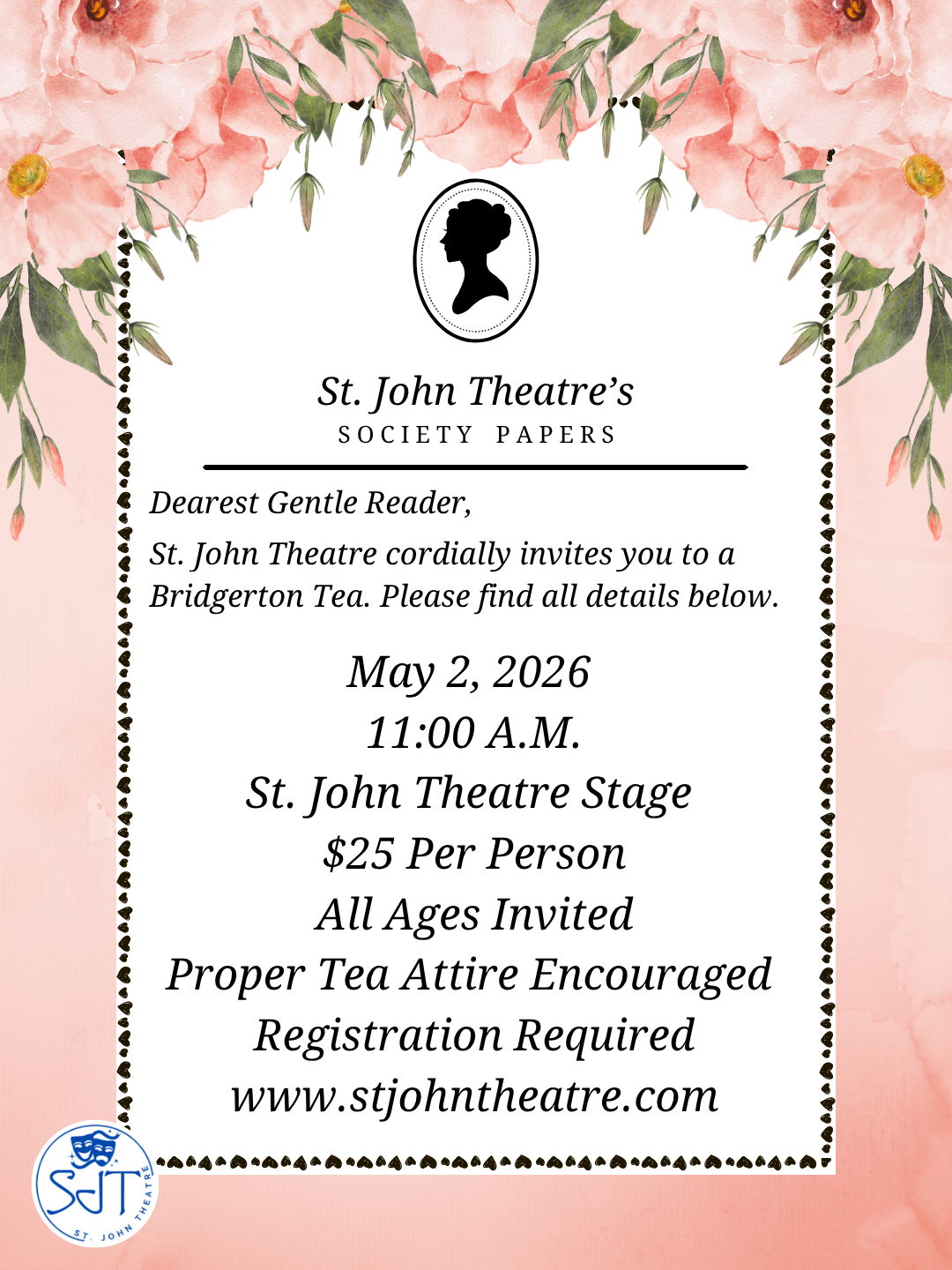Join the ladies of St. John Theatre for a Bridgerton inspired tea! We cordially invite you to this event on May 2, 2026, at 11:00 A.M. Dressing in your best tea attire is highly encouraged as we celebrate the Regency era with games, prizes, photo opportunities, and more!